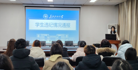 会议开始,贺菁蕾老师就近两年学校及学院学生违纪情况作了专题通报,围绕违纪行为的分类、数量变化、发展趋势与主要特点等方面进行系统梳理与深入剖析,引导学生深刻认识违纪行为的严重后果及不良影响。