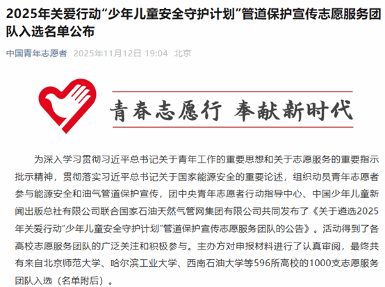 (记者 胡玉喆)近日,团中央青年志愿者行动指导中心、中国少年儿童新闻出版总社有限公司、国家石油天然气管网集团有限公司联合公布2025年“少年儿童安全守护计划”管道保护宣传志愿服务团队名单,人文科学学院“重走铁人路”铁人精神宣讲团成功入选。